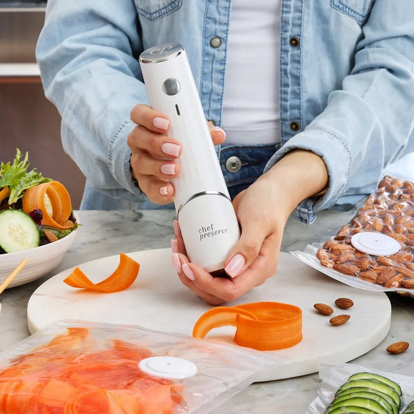 Chef Preserve™ effectively vacuum seals your food in less than 5 seconds and keeps it fresh 5 times longer. Reduce Waste & Save Money.